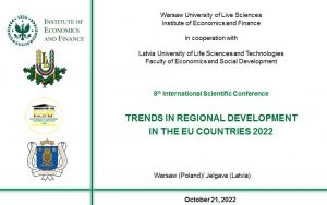 W dniu 21 października 2022 roku odbyła się 8 Międzynarodowa Konferencja Naukowa Trends in Regional Development in the EU Countries 2022 zorganizowana przez Katedrę Polityki Rozwoju i Marketingu SGGW w Warszawie wspólnie z Latvia University of Life Sciences and Technologies w Jełgawie, Latvian Academy of Sciences oraz Latvian Academy of Agricultural and Forestry Sciences. W wydarzeniu wzięli udział naukowcy reprezentujący różne krajowe oraz zagraniczne ośrodki naukowe– z Łotwy, Litwy, Ukrainy i Albanii. Uczestników konferencji powitała Pani Profesor Joanna Szwacka-Mokrzycka – Przewodnicząca Komitetu Naukowego, następnie Profesor Mariusz Maciejczak– Dyrektor Instytutu Ekonomii i Finansów SGGW w Warszawie, Profesor Irina Arhipova- Prorektor Latvia University of Life Sciences and Technologies oraz Profesor Baiba Rivža – członek Latvian Academy of Sciences.