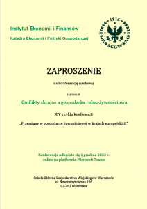 Mamy zaszczyt zaprosić Państwa do uczestnictwa w XIV konferencji naukowej z cyklu „Przemiany w gospodarce żywnościowej w krajach europejskich” pt. „Konflikty zbrojne a gospodarka rolno-żywnościowa”. Konferencja odbędzie się 1 grudnia 2022 r. online na platformie Microsoft Teams.